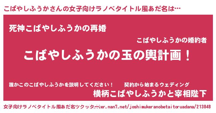 | 男性向けラノベタイトル風あだ名 | 『こばやしふうか~年齢イコール彼女いない歴の魔法使い~』 |