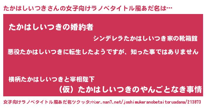 | 男性向けラノベタイトル風あだ名 | 『この素晴らしい世界にたかはしいつきを!』 |