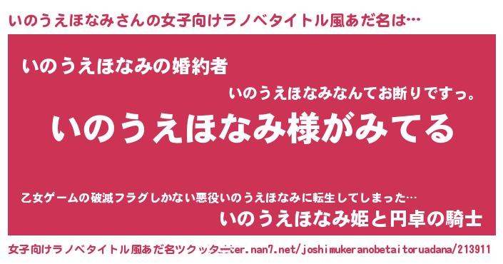 いのうえほなみさんの女子向けラノベタイトル風あだ名は… 『いのうえほなみ様がみてる』『いのうえほなみの婚約者』『いのうえほなみ姫と円卓の騎士』 ツクッター #女子向けラノベタイトル風あだ名ツクッター http://tkutter.nan7.net/joshimukeranobetaitoruadana/213911/
