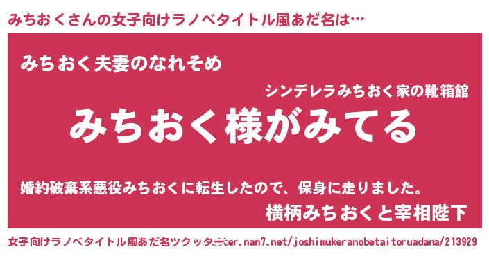 | 男性向けラノベタイトル風あだ名 | 『みちおくの嫁は女の子じゃないと思った?』 |