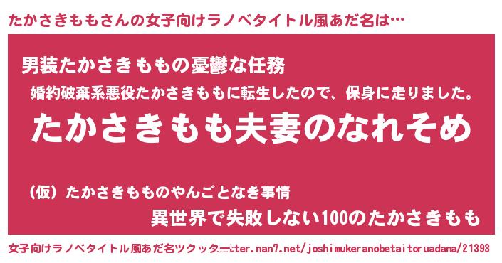| 男性向けラノベタイトル風あだ名 | 『おまえをオタクにしてやるから、俺をたかさきももにしてくれ! 』 |