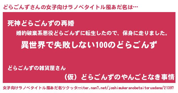 | 男性向けラノベタイトル風あだ名 | 『どらごんずという概念が存在しない退屈な世界 』 |