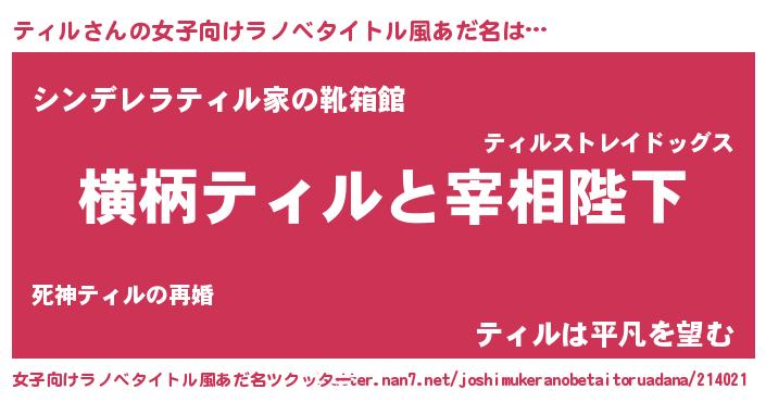 | 男性向けラノベタイトル風あだ名 | 『ティルに滅ぼされるだけの簡単なお仕事です』 |