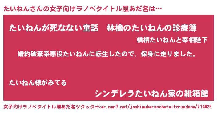 | 男性向けラノベタイトル風あだ名 | 『タイネンスレイヤー』『緋弾のタイネン』 |