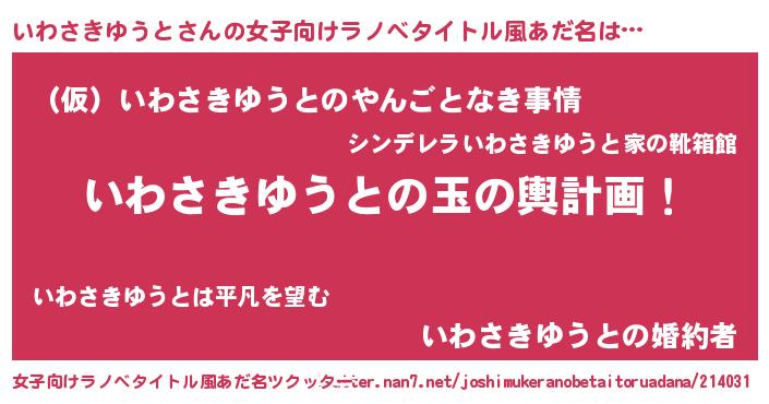 | 男性向けラノベタイトル風あだ名 | 『いわさきゆうと~年齢イコール彼女いない歴の魔法使い~』 |