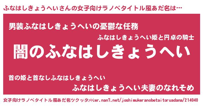 | 男性向けラノベタイトル風あだ名 | 『Re:ふなはしきょうへいから始める異世界生活』 |