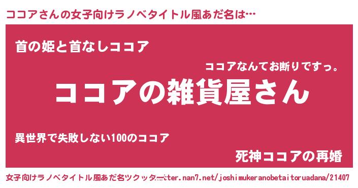 ココアさんの女子向けラノベタイトル風あだ名は… 『ココアの雑貨屋さん』『首の姫と首なしココア』『死神ココアの再婚』 ツクッター #女子向けラノベタイトル風あだ名ツクッター http://tkutter.nan7.net/joshimukeranobetaitoruadana/21407/
