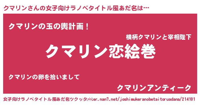 | 男性向けラノベタイトル風あだ名 | 『おまえをオタクにしてやるから、俺をクマリンにしてくれ! 』 |