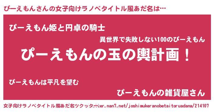 | 男性向けラノベタイトル風あだ名 | 『転生したらぴーえもんだった件』 |