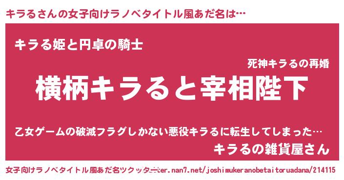 | 男性向けラノベタイトル風あだ名 | 『キラるに滅ぼされるだけの簡単なお仕事です』 |