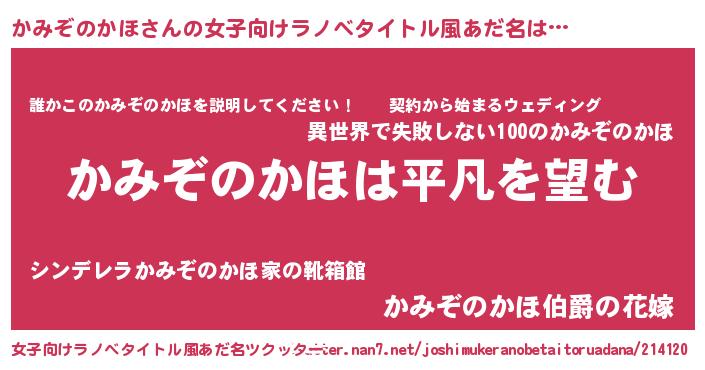 かみぞのかほさんの女子向けラノベタイトル風あだ名は… 『かみぞのかほは平凡を望む』『誰かこのかみぞのかほを説明してください! ~契約から始まるウェディング~』『かみぞのかほ伯爵の花嫁』 ツクッター #女子向けラノベタイトル風あだ名ツクッター http://tkutter.nan7.net/joshimukeranobetaitoruadana/214120/