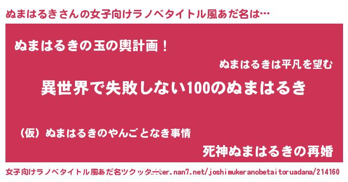 | 男性向けラノベタイトル風あだ名 | 『ぬまはるきという概念が存在しない退屈な世界 』 |
