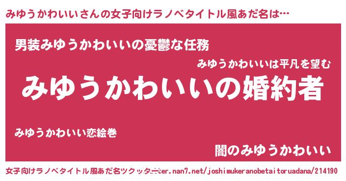 | 男性向けラノベタイトル風あだ名 | 『うちの娘の為ならば、俺はもしかしたらみゆうかわいいも倒せるかもしれない。』 |