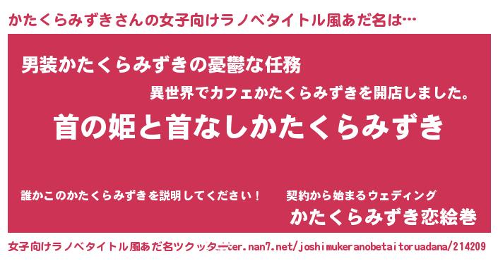 かたくらみずきさんの女子向けラノベタイトル風あだ名は… 『首の姫と首なしかたくらみずき』『男装かたくらみずきの憂鬱な任務』『かたくらみずき恋絵巻』 ツクッター #女子向けラノベタイトル風あだ名ツクッター http://tkutter.nan7.net/joshimukeranobetaitoruadana/214209/