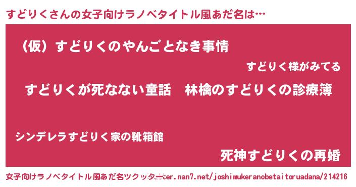 | 男性向けラノベタイトル風あだ名 | 『魔弾の王とすどりく』『すどりくの憂鬱』 |