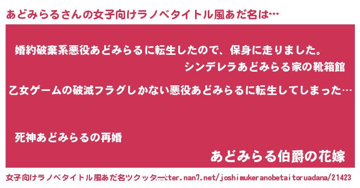 | 男性向けラノベタイトル風あだ名 | 『この素晴らしい世界にあどみらるを!』 |