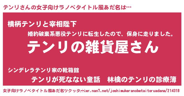 | 男性向けラノベタイトル風あだ名 | 『やはりテンリの青春ラブコメはまちがっている 』 |