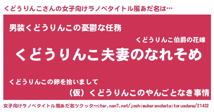| 男性向けラノベタイトル風あだ名 | 『おまえをオタクにしてやるから、俺をくどうりんこにしてくれ! 』 |