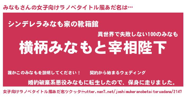 | 男性向けラノベタイトル風あだ名 | 『みなもに滅ぼされるだけの簡単なお仕事です』 |