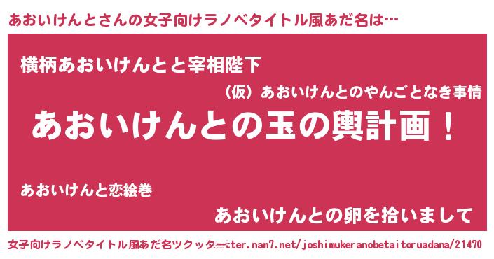 | 男性向けラノベタイトル風あだ名 | 『あおいけんと~年齢イコール彼女いない歴の魔法使い~』 |