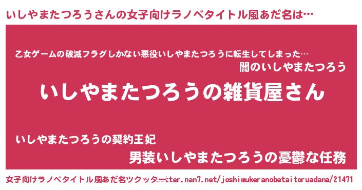| 男性向けラノベタイトル風あだ名 | 『やはりいしやまたつろうの青春ラブコメはまちがっている 』 |