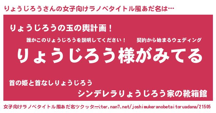 | 男性向けラノベタイトル風あだ名 | 『りょうじろうの嫁は女の子じゃないと思った?』 |