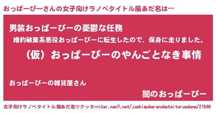 おっぱーぴーさんの女子向けラノベタイトル風あだ名は… 『(仮)おっぱーぴーのやんごとなき事情』『男装おっぱーぴーの憂鬱な任務』『闇のおっぱーぴー』 ツクッター #女子向けラノベタイトル風あだ名ツクッター http://tkutter.nan7.net/joshimukeranobetaitoruadana/21568/