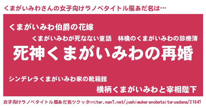 | 男性向けラノベタイトル風あだ名 | 『ノーゲーム・ノークマガイミワ』 |