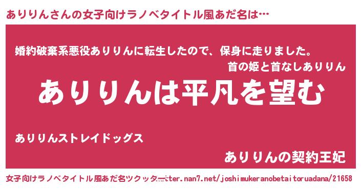 | 男性向けラノベタイトル風あだ名 | 『ダンジョンにありりんを求めるのは間違っているだろうか』 |