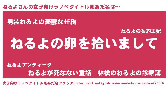 | 男性向けラノベタイトル風あだ名 | 『ねるよの嫁は女の子じゃないと思った?』 |