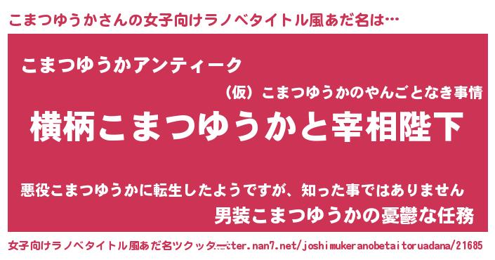 こまつゆうかさんの女子向けラノベタイトル風あだ名は… 『横柄こまつゆうかと宰相陛下』『こまつゆうかアンティーク』『男装こまつゆうかの憂鬱な任務』 ツクッター #女子向けラノベタイトル風あだ名ツクッター http://tkutter.nan7.net/joshimukeranobetaitoruadana/21685/