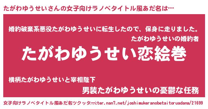 | 男性向けラノベタイトル風あだ名 | 『おまえをオタクにしてやるから、俺をたがわゆうせいにしてくれ! 』 |