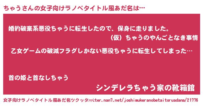 | 胡散臭い通販商品みたいなあだ名 | 『世界中を虜にした100年もののヴィンテージワイン…その名も「ちゃう」』 |