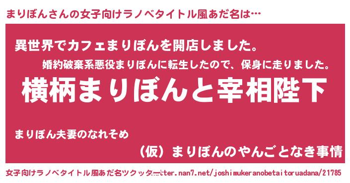 まりぼんさんの女子向けラノベタイトル風あだ名は… 『横柄まりぼんと宰相陛下』『異世界でカフェまりぼんを開店しました。』『(仮)まりぼんのやんごとなき事情』 ツクッター #女子向けラノベタイトル風あだ名ツクッター http://tkutter.nan7.net/joshimukeranobetaitoruadana/21785/