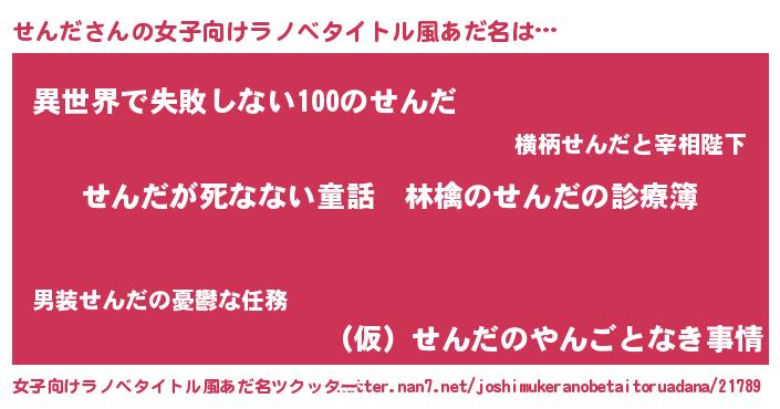 | 男性向けラノベタイトル風あだ名 | 『魔弾の王とせんだ』『せんだの憂鬱』 |