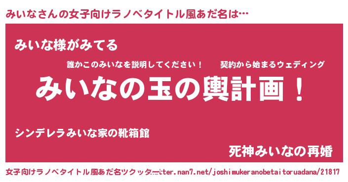 みいなさんの女子向けラノベタイトル風あだ名は… 『みいなの玉の輿計画!』『みいな様がみてる』『死神みいなの再婚』 ツクッター #女子向けラノベタイトル風あだ名ツクッター http://tkutter.nan7.net/joshimukeranobetaitoruadana/21817/