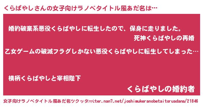 | 男性向けラノベタイトル風あだ名 | 『この素晴らしい世界にくらばやしを!』 |