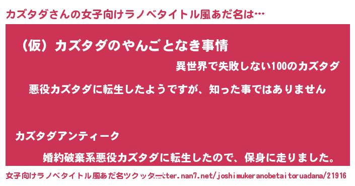 | 男性向けラノベタイトル風あだ名 | 『この素晴らしい世界にカズタダを!』 |