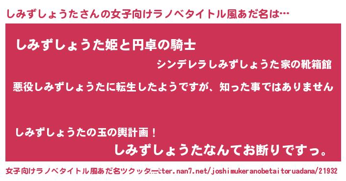 | 男性向けラノベタイトル風あだ名 | 『この素晴らしい世界にしみずしょうたを!』 |