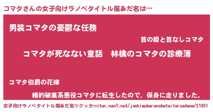 | 男性向けラノベタイトル風あだ名 | 『魔弾の王とコマタ』『コマタスレイヤー』 |
