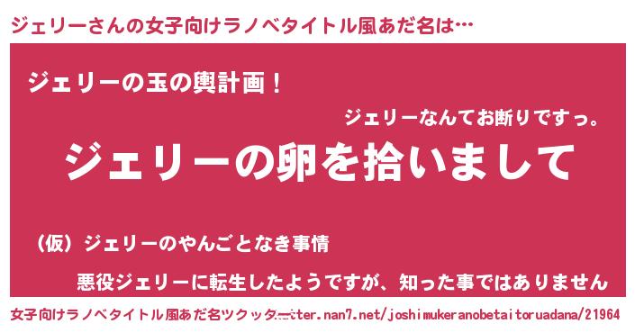 | 男性向けラノベタイトル風あだ名 | 『ダンジョンにジェリーを求めるのは間違っているだろうか』 |