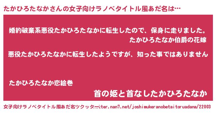 | 男性向けラノベタイトル風あだ名 | 『この素晴らしい世界にたかひろたなかを!』 |