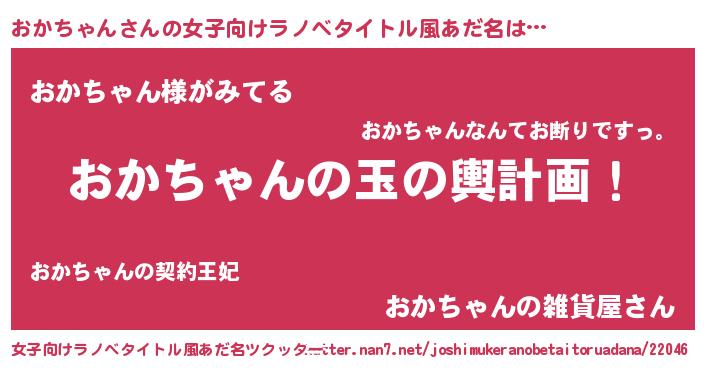 | 男性向けラノベタイトル風あだ名 | 『おかちゃん~年齢イコール彼女いない歴の魔法使い~』 |