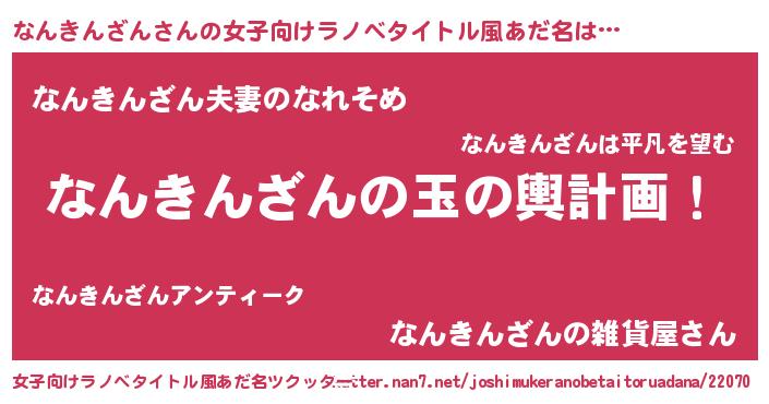 | 男性向けラノベタイトル風あだ名 | 『なんきんざん~年齢イコール彼女いない歴の魔法使い~』 |