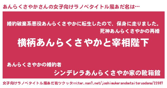 | 男性向けラノベタイトル風あだ名 | 『あんらくさやかに滅ぼされるだけの簡単なお仕事です』 |