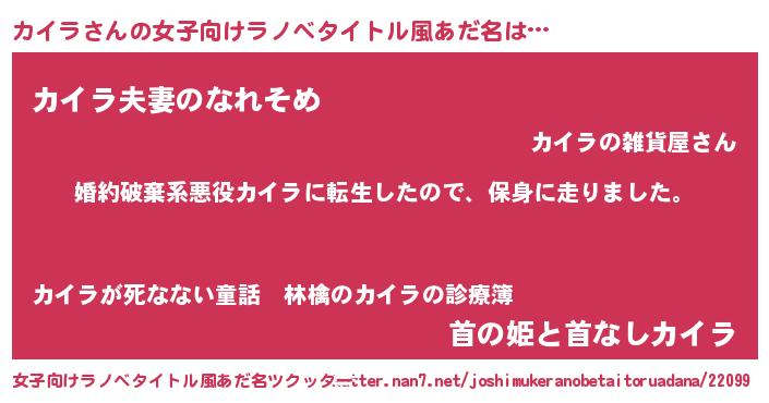 | 男性向けラノベタイトル風あだ名 | 『カイラスレイヤー』『魔弾の王とカイラ』 |