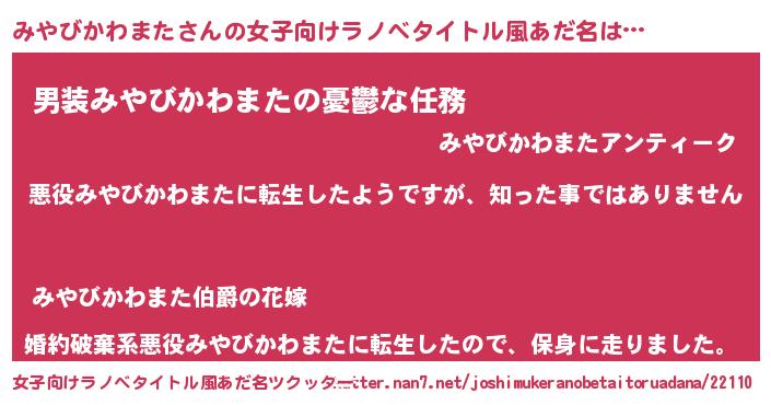 | ヘコむあだ名 | 『酢こんぶ』『みやびかわまた(小並感)』 |