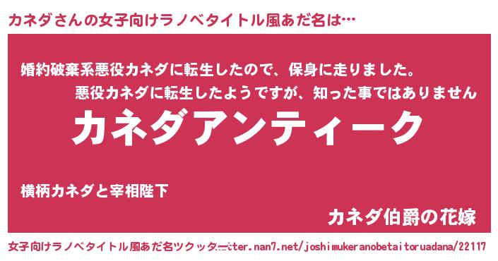 カネダさんの女子向けラノベタイトル風あだ名は… 『カネダアンティーク』『婚約破棄系悪役カネダに転生したので、保身に走りました。』『カネダ伯爵の花嫁』 ツクッター #女子向けラノベタイトル風あだ名ツクッター http://tkutter.nan7.net/joshimukeranobetaitoruadana/22117/