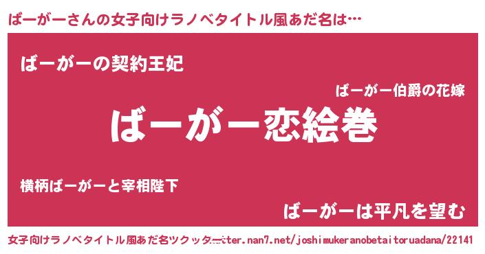| 男性向けラノベタイトル風あだ名 | 『おまえをオタクにしてやるから、俺をばーがーにしてくれ! 』 |