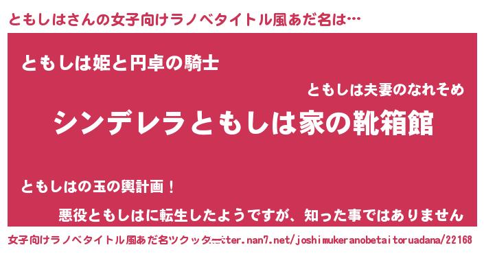 ともしはさんの女子向けラノベタイトル風あだ名は… 『シンデレラともしは家の靴箱館』『ともしは姫と円卓の騎士』『悪役ともしはに転生したようですが、知った事ではありません』 ツクッター #女子向けラノベタイトル風あだ名ツクッター http://tkutter.nan7.net/joshimukeranobetaitoruadana/22168/